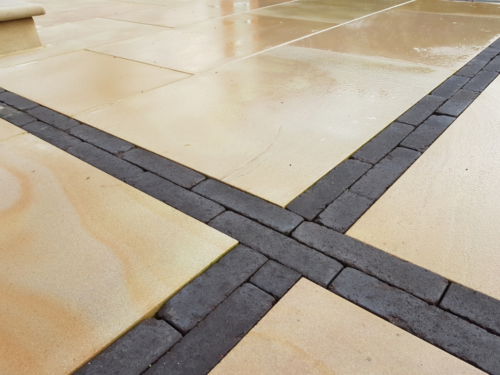 To break up what would have been a desert of stone, I decided to use the two main entrances as central axis of lines of black bricks, contrasting and visually dividing the space, meeting to create a focal square.