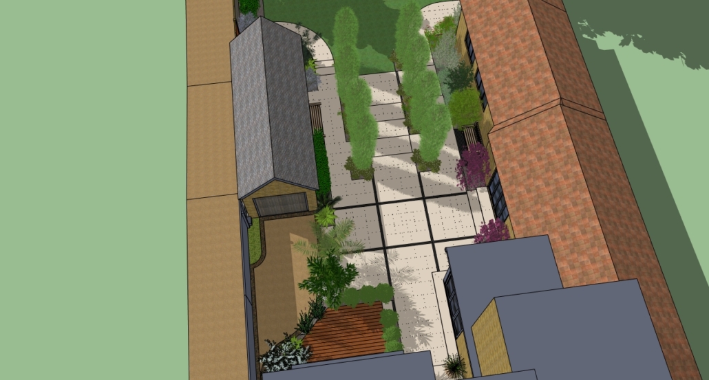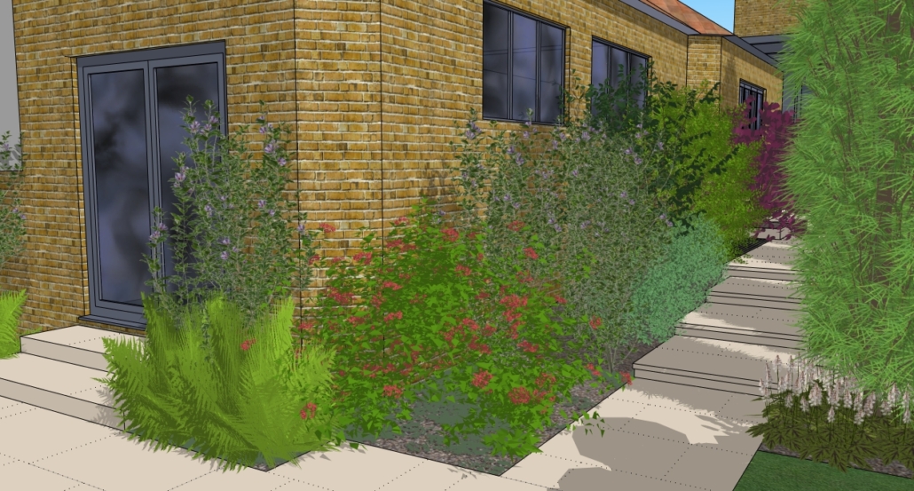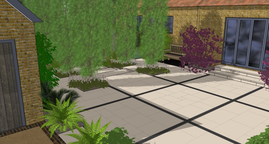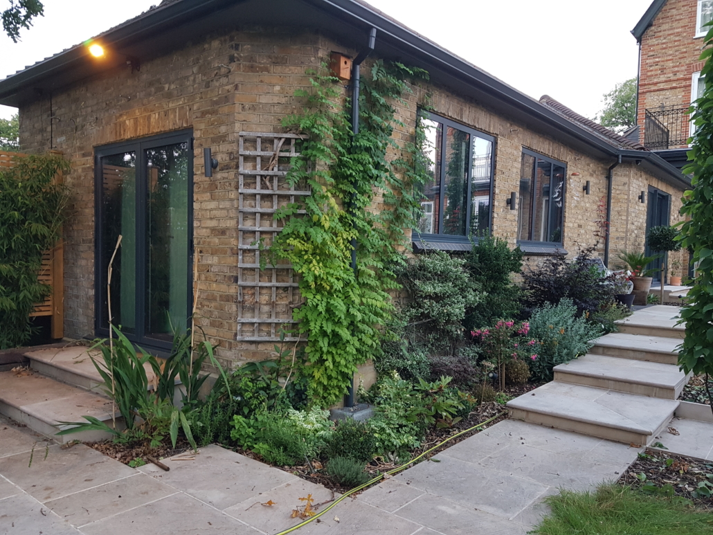 This large Victorian house had been recently updated with a modern kitchen extension and a side extension for a working studio. There was a wilderness of old concrete cazy paving with rough steps down to the lawn.