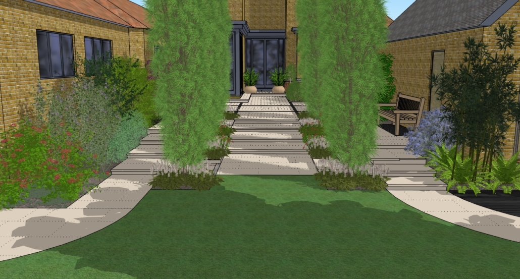The main rear doors of the house then led to central, tree lined steps with secondary paths & steps either side which were deliberately assymetrical, providing more interest.
