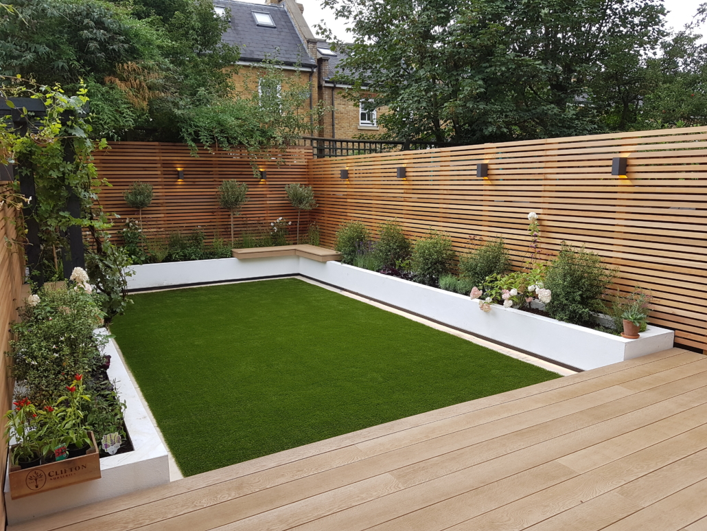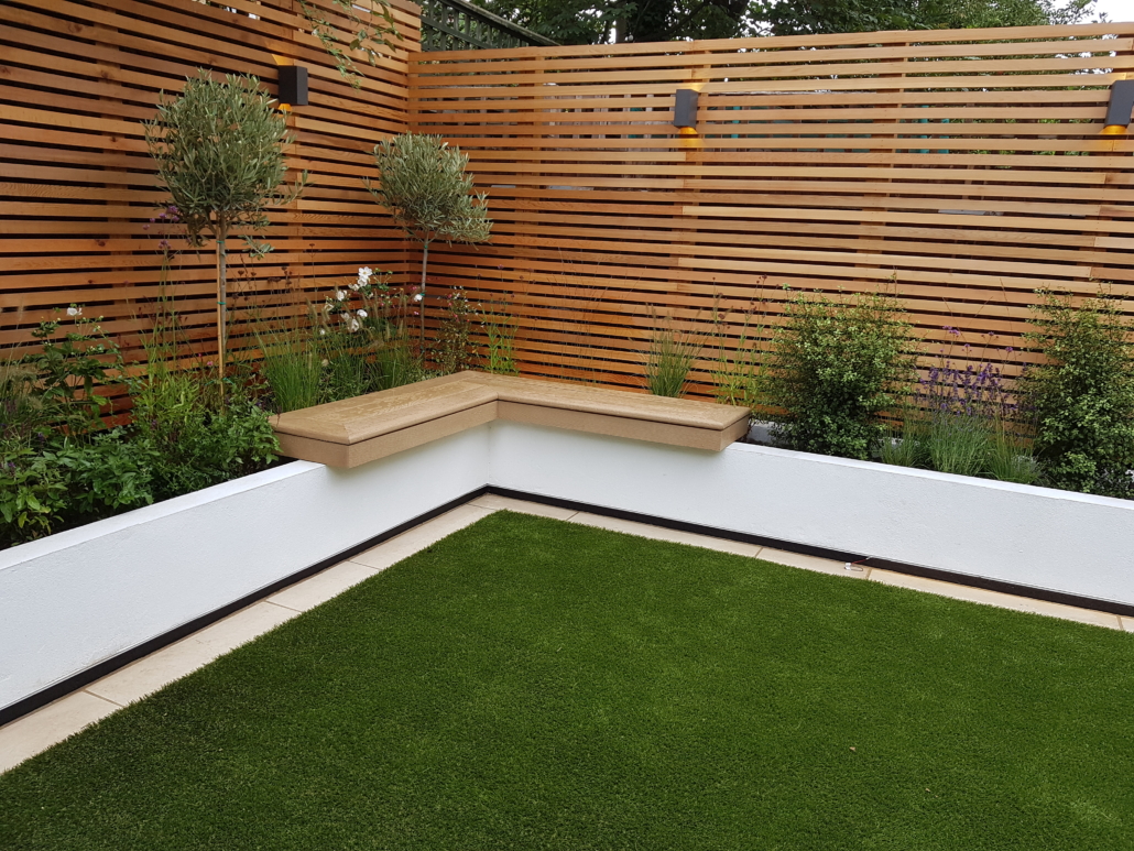 Porcelain paving surrounds the artificial grass, which is laid on a recycled rubber cushioning pad, ensuring that there will be no mud walked through the house. The deck and benches are constructed from Millboard composite deck boards, which dry off quickly after rain.