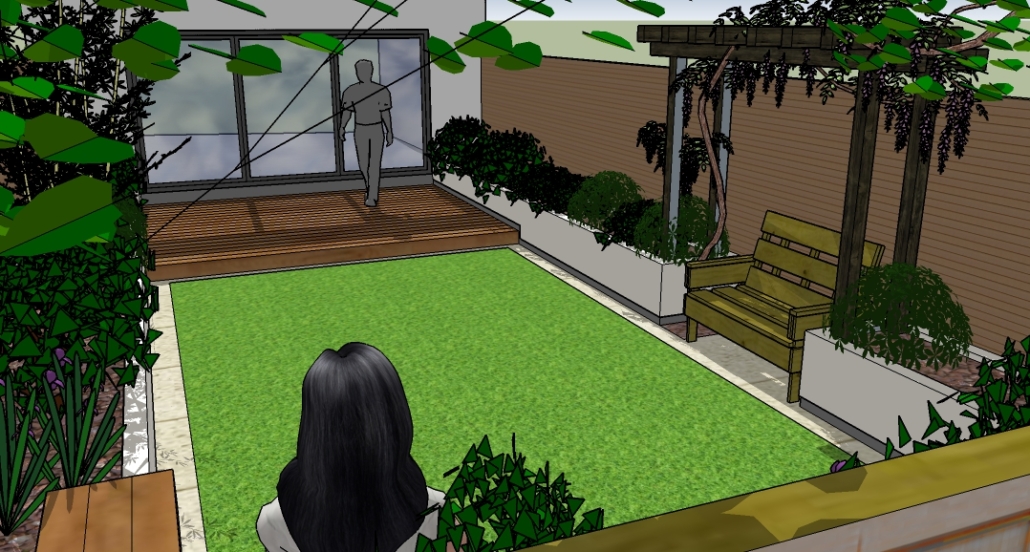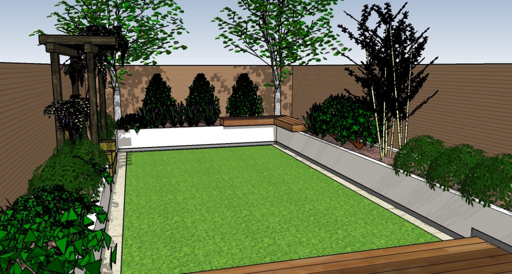The screens are of cedar battens fixed to all new posts. There is an LED lighting strip set back under the overhang of the retaining walls, giving a sleek light cast across the surface of the grass. Lush planting is vital in this garden to bring it all to life.