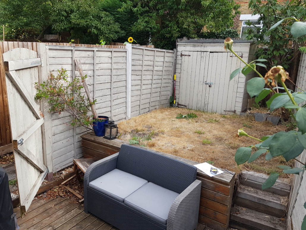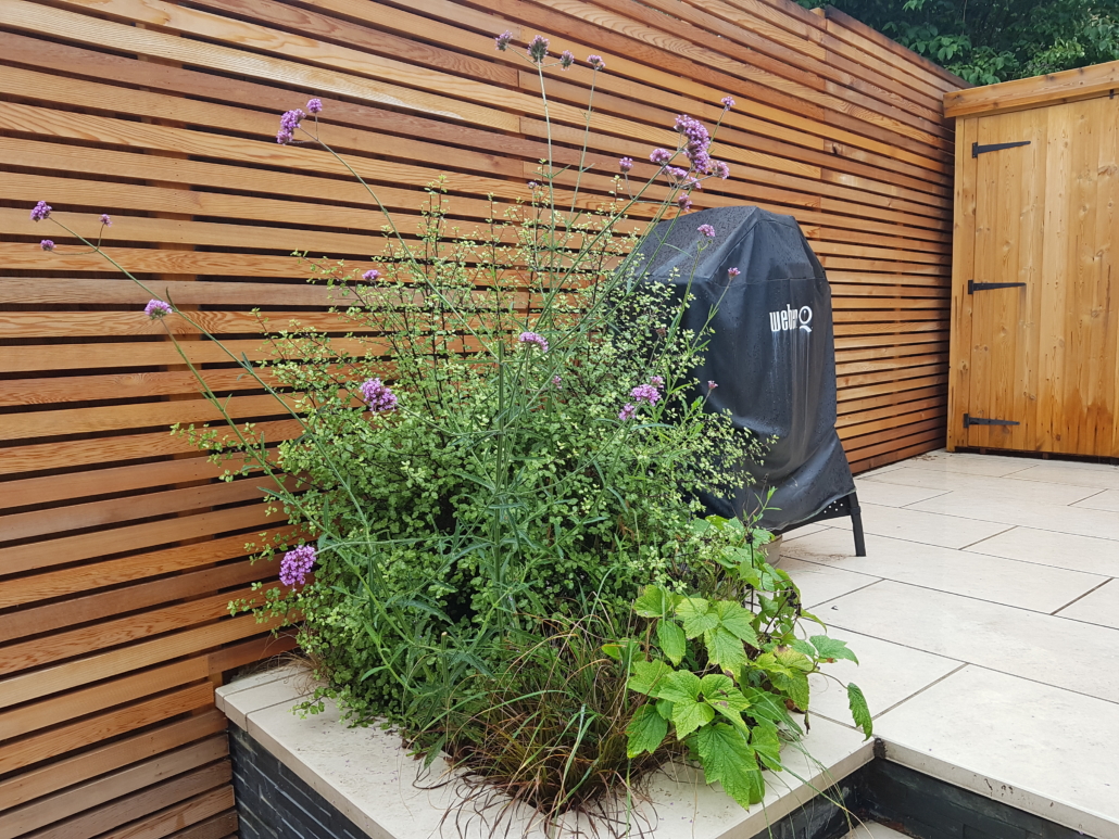 The other issue was being overlooked by surrounding properties. All of these issues were solved by Cedar batten screens fixed to a concrete post and rail fence, which allowed concrete gravel boards to retain the soil from both inside & outside the garden and support for the battens inside, and standard feather-edge boards outside the structure.