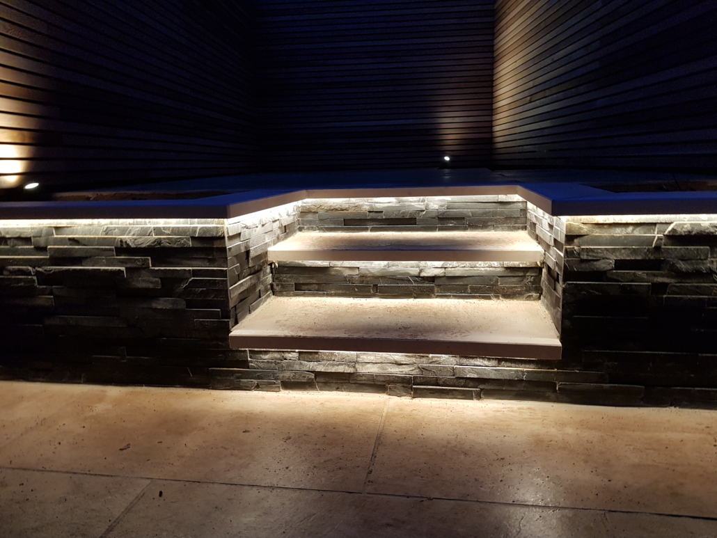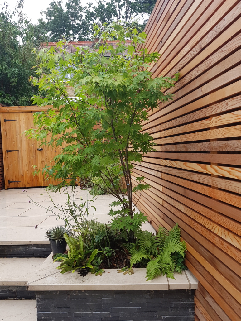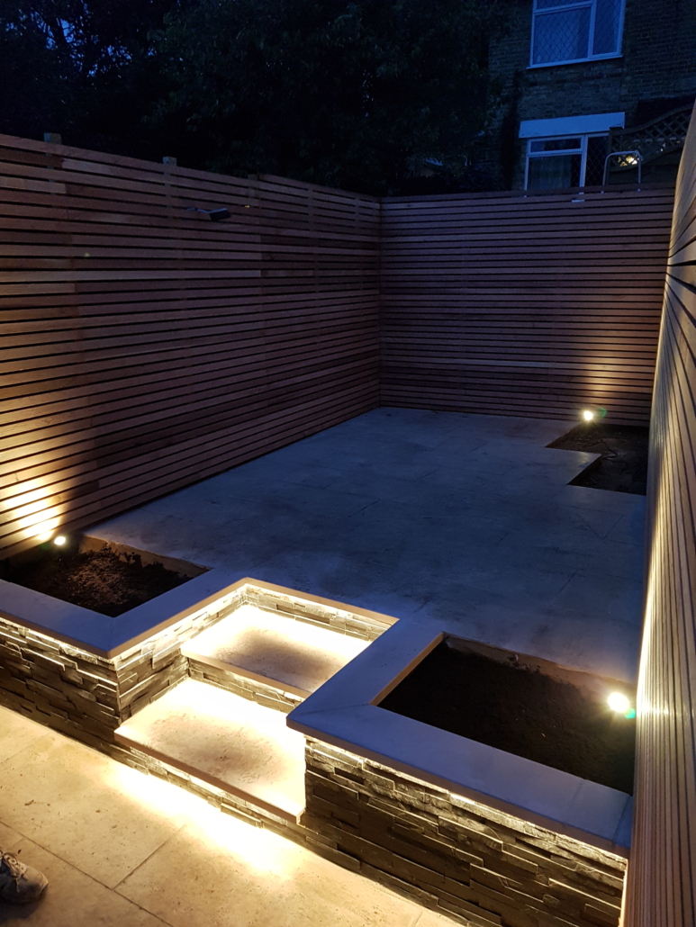The black slate cladding gives a great contrast and the Cedar helps to soften the feel. The garden really comes alive at night with the simple addition of three spotlights and LED strip lighting concealed behind the edges of the steps & coping, casting textured light over the slate.