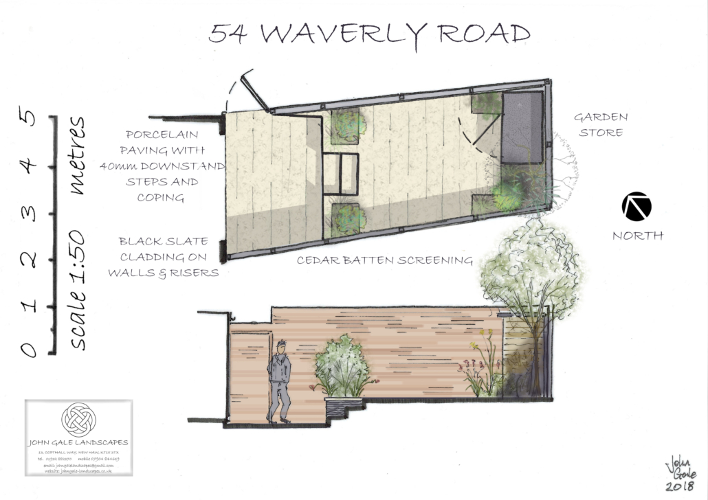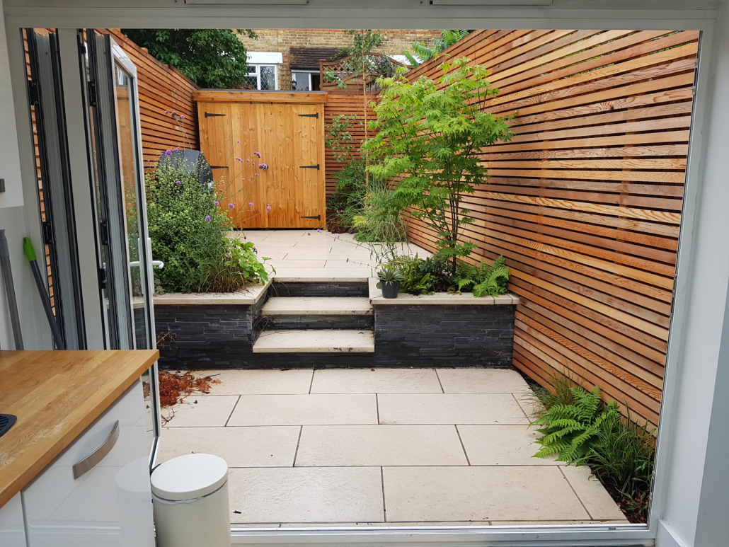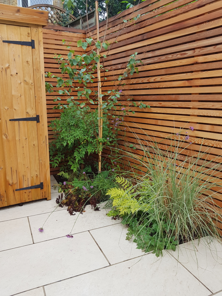 This tiny space was the smallest garden designed & built by us; it had added challenges, in that none of the boundaries were square to the house and that the levels sloped diagonally across the area.
